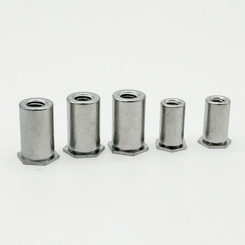 Slepa luknja z ravno glavo šesterokotnike, ki je zakovičena matica, je pritrdilna element, primeren za tanke materiale. Je močan in trpežen, nit pa ni enostavno nositi. Ima šestnajsto obliko za enostavno instalacijo, ravno glavo števca, ki sedi rdeči, in orehovo telo z slepo luknjo zaprte. Ko ga namestite, se matična matično deformira (kot kovičenje), da se zaklene na material.
