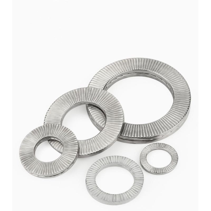TheDvojni samoplačni zaklepni podložkaje zasnovan tako, da se vijaki med vibracijami ali gibanjem ne razprostijo. Ima dva dela, fleksibilno jekleno zgornjo plast in spodnjo plast z zobmi. Skupaj ustvarijo dovolj trenja, da bi stvari zaklenili na svoje mesto.