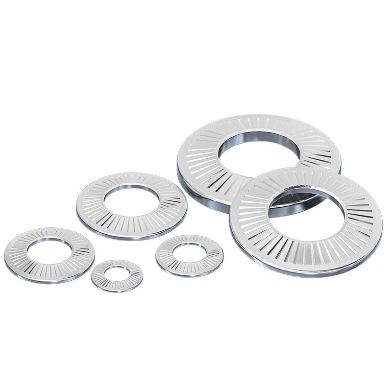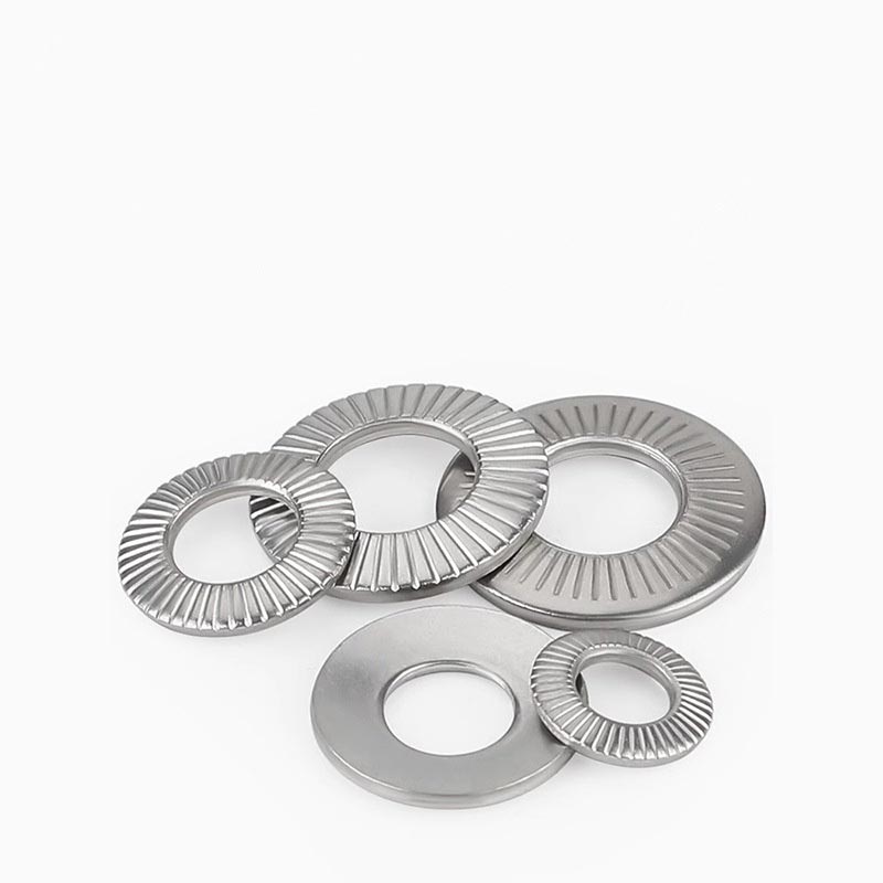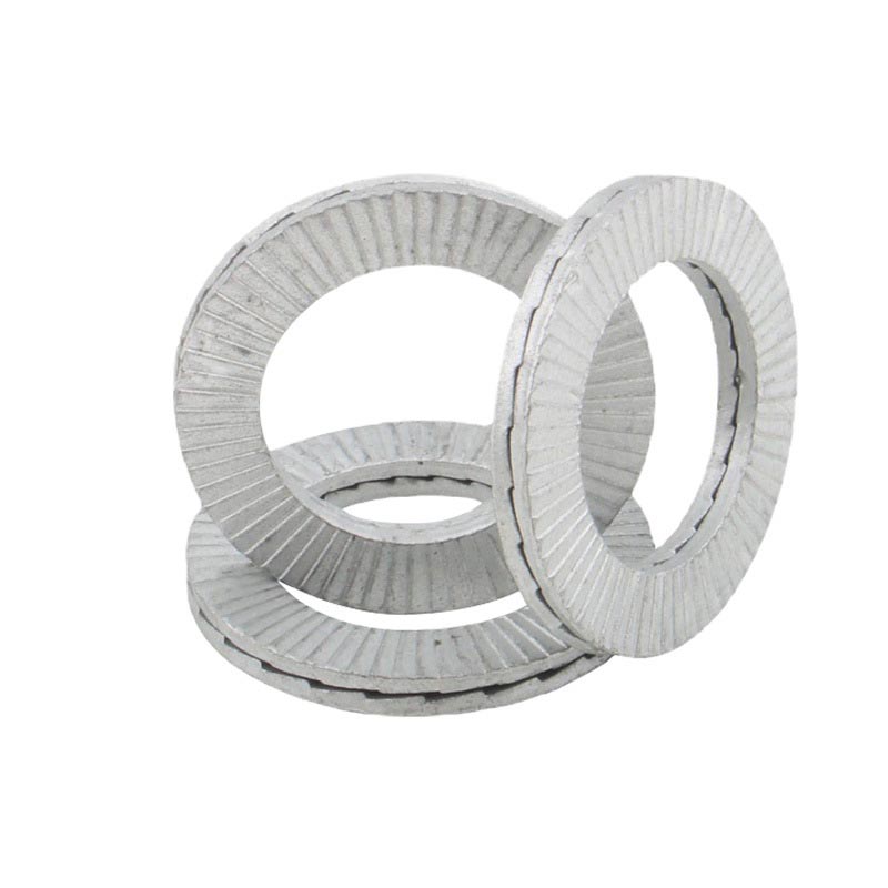 TheDvojna diska za zaklepanjeje narejen iz SAE 304/316 nerjavečega jekla ali ASTM A325 ogljikovega jekla, mešanja trdnosti in prilagodljivosti. Različice iz nerjavečega jekla delujejo bolje v zarjavelih ali mokrih okoljih, medtem ko imajo ogljikovo jeklo močnejšo natezno trdnost za težka delovna mesta. Uporabljajo toplotne obdelave, kot so gašenje in kaljenje, da bi bila trdota pravi (HRC 38-45) in se upirajo utrujenosti. Te izbire materialov trajajo dlje in so zanesljivejše od najlonskih ali enoplastnih podložk.