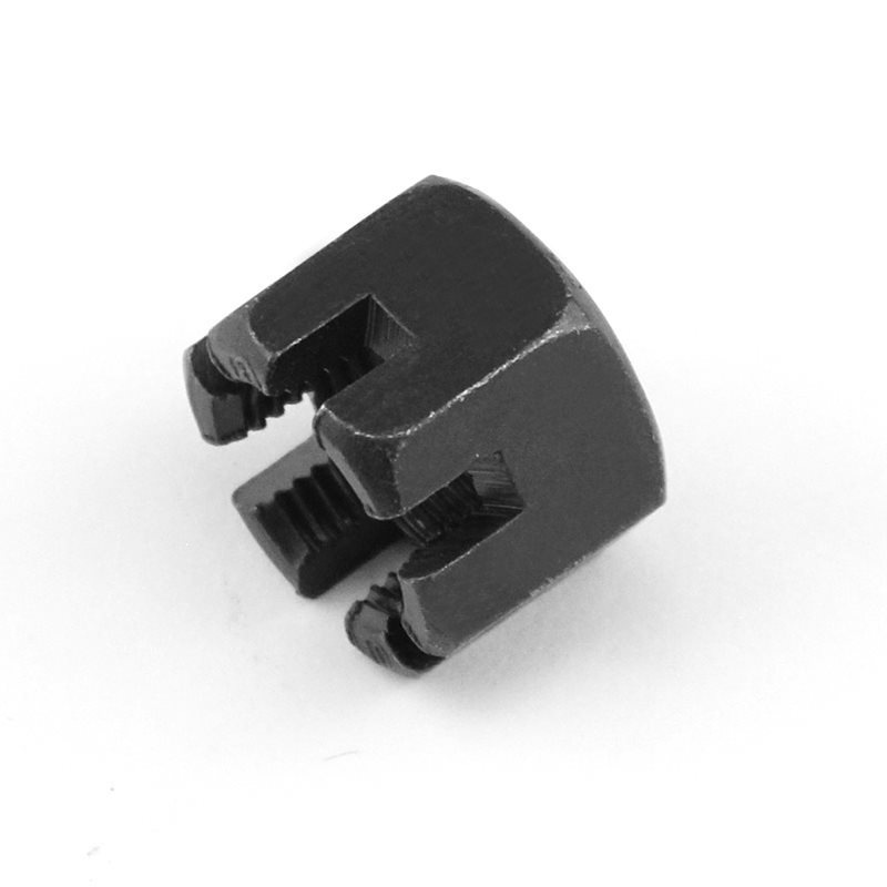 | Ključna lastnost | Te reže na vrhu se uporabljajo za namestitev zaklepnih zatičev ali varnostnih vrvi. Ko zategnete matico, speljite zatič skozi te reže in luknje na zapahu. To ga bo pritrdilo na svoje mesto (tudi ob močnih tresljajih se matica ne bo zrahljala). To je preprosta mehanska ključavnica, ki ne zahteva nobenih zapletenih premazov ali dodatnih komponent. |