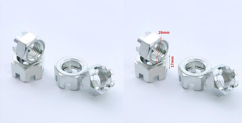 Metrični reža šesterokotni oreščkiLahko ga zaklenete z zatiči ali žicami, kar je zelo zanesljivo, da prepreči razmilitev. Na primer, primeren je za namestitev železniških vijakov na železnice in pritrditev tekočih trakov v rudniki, ki so mesta z velikimi vibracijami.