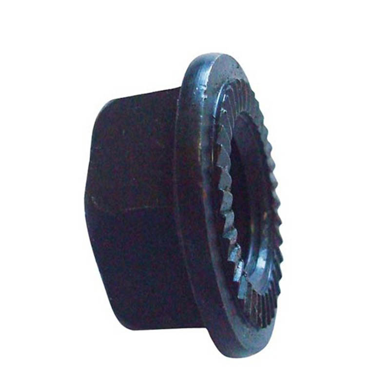 | Srednje ogljikovo jeklo | Te šesterokotne zaklepne matice z nazobčano prirobnico je mogoče uporabiti na komponentah avtomobilskega vzmetenja ali kljukah za priklopnike. Jeklo, uporabljeno zanje, je bilo toplotno obdelano, tako da se nazobčana struktura lahko trdno zaskoči, ne da bi se zlomila. Prenesejo tresljaje med vožnjo po avtocesti ali velike obremenitve brez popuščanja. Običajno so prevlečeni z debelejšo plastjo cinka. |
