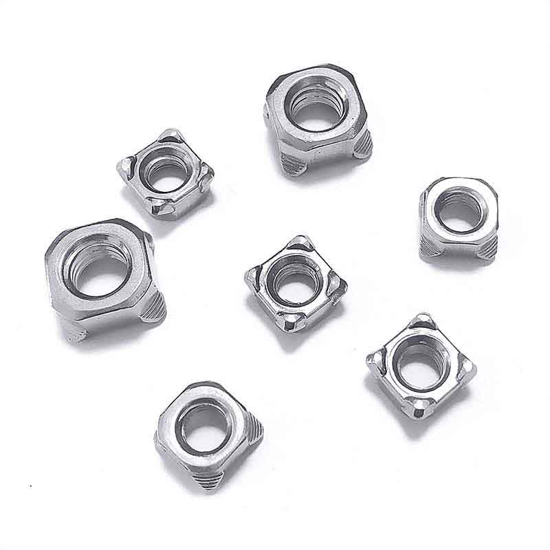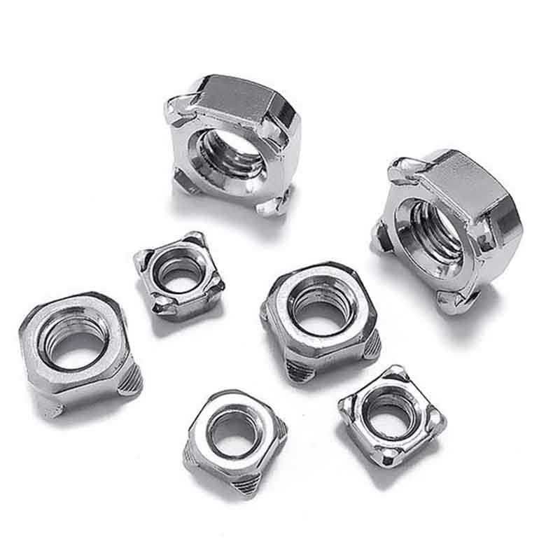 Kvadratne varjene matice tipa Bnimajo lukenj ali preprostih vogalov; namesto tega so na vsakem vogalu ločene izbokline. To je ključna lastnost. Na te štrline lahko neposredno varite. Ta zasnova običajno zagotavlja bolj enakomerno zvarno jedro, ker se izbokline stopijo in zlijejo s spodnjo kovinsko ploščo. To je običajna specifikacija, zlasti v avtomobilski industriji.